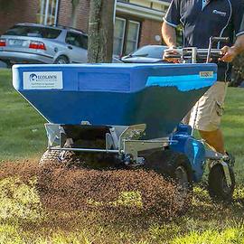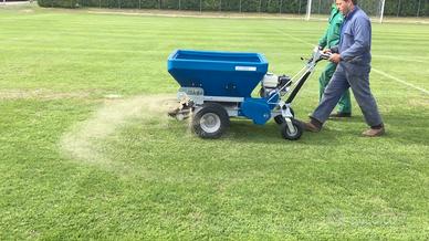 Noleggiamo questo spandisabbia semovente rotativo, modello professionale che garantisce una distribuzione rapida e precisa di sabbia e terriccio.