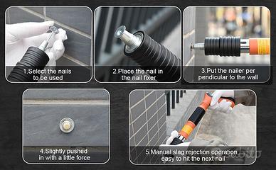 Funzionamento semplice: questa pistola sparachiodi in cemento leggero è alimentata a mano. Facile da usare, bastano cinque semplici passaggi: 1. Indossare occhiali protettivi, guanti e tappi per le orecchie; 2. Scegli l'unghia; 3. Pistola sparachiodi verticalmente sul posto di lavoro pronta a sparare; 4. Forza verticale nel muro; 5. Tenere il coperchio della marmitta e comprimerlo più volte. Se non funziona, elimina i residui prima di provare qualche altro chiodo.