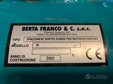 Spazzaneve per motocoltivatore Berta, mod. 70, anno di fabbricazione 2007, doppio stadio, comprato nuovo e MAI USATO.