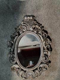 Elegante specchiera ovale in stile barocco con raffinata finitura anticata. Ricca di dettagli decorativi e volute floreali, ideale per ingresso, camera o soggiorno. In ottime condizioni, dimensioni 50x38 cm.