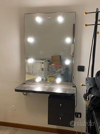 Specchio da trucco rettangolare con illuminazione integrata a lampadine perimetrali.Struttura da parete con mensola inferiore e mobiletto con cassetto integrato.Specchio in vetro con supporti di fissaggio metallici visibili.Sistema di illuminazione elettrico integrato nello specchio.