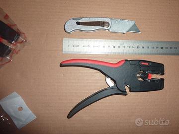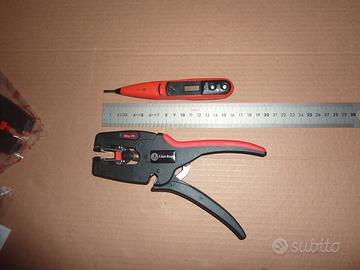 Set composto da 1 pinza spelafili automatica + 1 cercafase con display 12-250V + 1 cutter in alluminio con lama da 60mm ripiegabile.