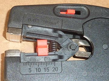 La spelacavi frontale consente di spelare fili singoli e cavi da 0,3 a 10 millimetri quadri / AWG 32-7. è realizzata in robusto polimero sintetico, dotata di lame in acciaio temprato, ganasce blocca cavo in acciaio, regolazione per variare la pressione delle lame, cesoia tagliafilo e impugnatura con finitura gommata. La struttura in materiale sintetico protegge da eventuale folgorazione a causa di un filo sotto tensione.