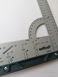 squadra multiuso Wolfcraft, specificamente il modello 5205000 con lati da 200 x 300 mm. Questo strumento in acciaio combina diverse funzioni per misurare, tracciare, disegnare e tagliare in modo guidato.