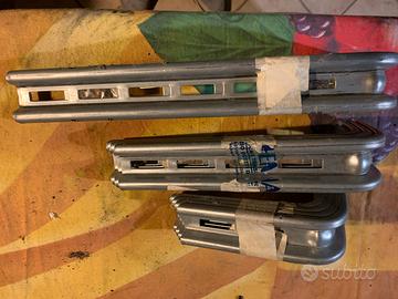 Staffe di metallo spesse: 2 da 35cm x5 larghe; 3 da 25cm x 5 ; 4 da 15cm x 5; tutte ,tra angolo e angolo, misurano 8 cm: in tutto 9 staffe come da foto