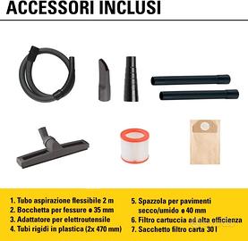 Accessori inclusi: 1 tubo di aspirazione flessibile e resistente alla torsione lungo 2 m; 2 tubi di aspirazione in plastica lunghi 47 cm; 1 spazzola per pavimenti per solidi e liquidi; 1 bocchetta per fessure