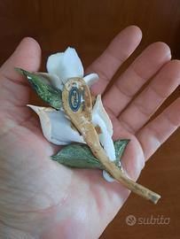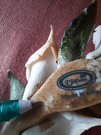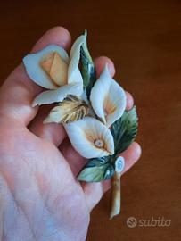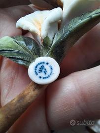 Deliziosa decorazione floreale in ceramica Capodimonte, con 2 calle e una rosa. I pistilli delle due calle mancano, SONO ROTTI e inoltre nell'ultima foto è indidato il punto in cui lo stelo È STATO RIATTACCATO. (La riparazione è veramente invisibile). Lunghezza 12 cm. Il prezzo tiene conto di questi danni. - Fiori bianchi con dettagli colorati. - Foglie verdi realistiche. - Stelo marrone con etichetta. - Realizzata in ceramica di alta qualità.