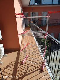 stendiancheria con 3 ripiani verticali, ruote e agganci laterali. materiale: plastica e metallo.