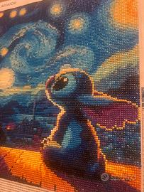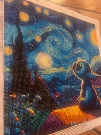 L’immagine mostra un mosaico realizzato con la tecnica del diamond painting, un’arte manuale che utilizza piccole gemme colorate per comporre un disegno.