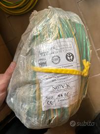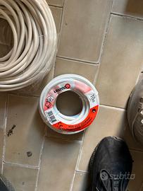 • 4 Matasse di Cavo Unipolare FS17 / N07V-K (Nero): * 3 matasse da 100m (sezione 1,5 mm²) • 1 matassa da 120m (sezione 1,5 mm²) • 1 Matassa Cavo di Terra (Giallo/Verde): Sezione 16 mm², lunghezza 100m (marca Ecoflex N07V-K). • 1 Matassa Cavo Coassiale (TV/Satellite): Marca Cavel, lunghezza 200m. • 2 Matasse Cavo Tripolare Bianco (H05VV-F): • 1 matassa da 25m (3x1 mm²) • 1 matassa da 10m (3x1 mm²)