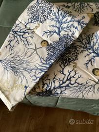 Stoffa per rivestimento, tappazzeria o copriletto da cucire. Disegno stampa corallo blu/avion/ beige. Misure m.2,06 x m.2,84, da orlare o tagliare a misura. Mai usata. Provenienza tessuti Forte dei Marmi.