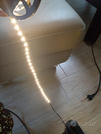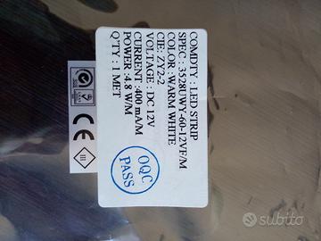 Striscia LED adesiva nuova perfettamente funzionante. Vendo perché troppo corta per l'utilizzo che né volevo fare. Lunghezza striscia luminosa 1 metro ma possibilità di accorciarla ( tacche per il taglio indicate sulla striscia). Lunghezza cavo 3 metri. Luce calda. Per caratteristiche tecniche vedere ultima foto.