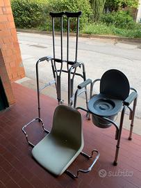 Vendo attrezzatura per persone problematiche e in ottimo stato...stampelle regolabili , wc , deambulatore regolabile in altezza con rotelle anteriori , seggiolino da posizionare sui bordi della vasca per lavarsi regolabile in larghezza , possono essere vendute anche singolarmente....