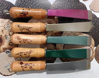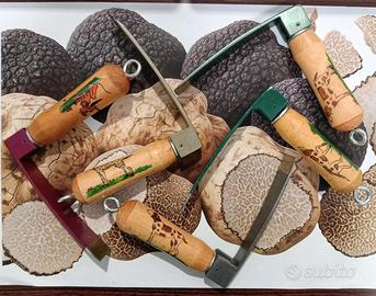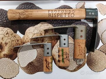 Ogni strumento è di alta qualità, con manico in legno decorato e inciso a mano (pirografo/pittura). Include scene con cani da tartufo e, su alcuni pezzi, la scritta "PROFONDO RISPETTO". Disponibili: Zappini Richiudibili e Fissi, (diverse forme). Vanghetto Richiudibile. Coltellino Punta a Cuore. Perfetti per tartufai e collezionisti. Pezzi unici e robusti. Contattami al 3490874548 per informazioni.