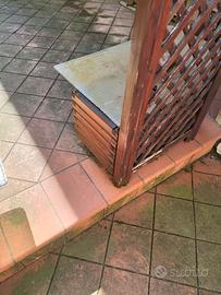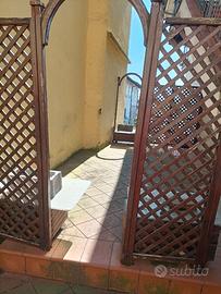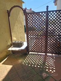 Struttura per fiori rampicanti con 4 pannelli e tre fioriere con tre archi Dimensioni parte più piccola 209 h 215 lunch e quella più lunga 209 h per 265 lunghezza Necessitano di una pitturata di impregnante e alcune parti sono leggermente danneggiate