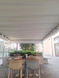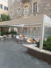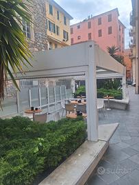 vendo struttura per dehor motorizzata con chiusura manuale sui tre lati , con illuminazione ideale per locali e giardini privati, ottimo stato . altezza 2,60 Lunghezza 6,75 Larghezza 3,90 smontaggio e trasporto a carico dell'acquirente