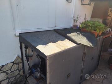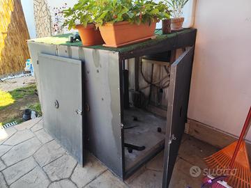 Struttura in ferro battuto. Metri 2x1x1 con due sportelli laterali di cui uno necessita di una saldatura sulla cerniera. Le macchie che si vedono in foto sono dovute al wd40 usato per svitare le viti. Una verniciatina e torna nuovo. C'è anche un gruppo ele a benzina 13 cavalli