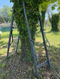 una struttura in ferro battuto, un elemento decorativo da giardino, per appoggiare le piante eccetera