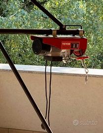 Montacarichi in ferro molto robusto con base larga, braccio a bandiera estensibile e struttura di tenuta a soffitto. Verricello elettrico non incluso. Possibilità di visione e ritiro in zona, grazie.