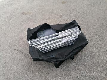 Ideale per Fotografi o fiere, vendesi espositore struttura modulare in alluminio per teli pubblicitari, mai usata, praticamente nuova, viene fornita nella sua borsa originale e striscia a strappo ancora nel suo imballo originale, le immagini con la tela sono solo illustrative ma la tela non è inclusa nella vendita perché non ce l'ho. La si fa fare in base alle propie esigenze.