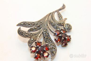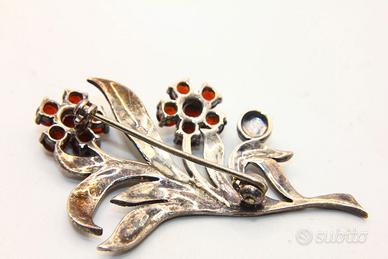 Un gioiello che incanta lo sguardo una spilla che narra la raffinatezza degli anni Trenta realizzata in argento sterling con minuziosi dettagli in marcasite luminose come minuscole stelle i fiori delicati sono impreziositi da granati dal colore intenso e profondo un omaggio all'eleganza di un'epoca passata le dimensioni di circa 49 x 32 millimetri la rendono un accessorio notevole ma non eccessivo perfetto per aggiungere un tocco di fascino vintage al tuo stile.