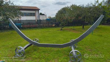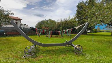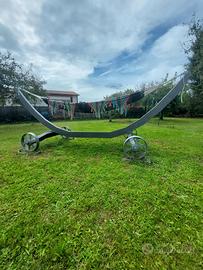 Supporto per amaca in acciaio verniciato, con quattro ruote in ghisa con telo amaca. SOLO SE INTERESSATI CONTATTARE IL NUMERO. PREZZO DA STABILIRE.