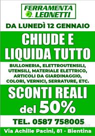 Causa svendita TUTTO AL -50% presso FERRAMENTA LEONETTI VIA ACHILLE PACINI N 81 BIENTINA (PI) Da €50 a €25