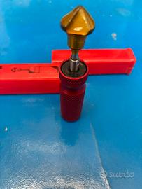 Vendesi kit svasatore manuale professionale di precisione, marca C.C.P. (Countersink Tools), completamente nuovo e mai utilizzato. L'utensile è fondo di magazzino, mai usato! • Impugnatura a cricchetto CSH-R(S): In alluminio anodizzato rosso con finitura zigrinata antiscivolo. Meccanismo a cricchetto perfetto, mai azionato sotto carico. • Svasatore CS-20: Punta svasatrice con rivestimento in Nitruro di Titanio (TiN - colore oro) integro al 100%.