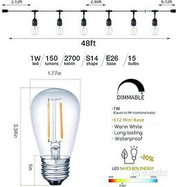 Catena Luci Esterno Giardino con 15 2W Bicchiere Lampadine, Commerciale Impermeabile IP65 Catena Luminosa LED per Gazebo Terrazza Festa, 2700K