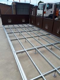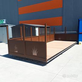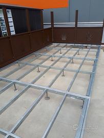 Basamento formato da struttura in ferro zincata a caldo con appositi piedini regolabili. Piano di calpestio formato da doghe tipologia "Massive 140" colore RAL 522 fissato con proprie clips nascoste.