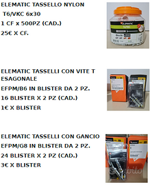 SVUOTO MAGAZZINO Tasselli e ancoranti professionali SPIT – ELEMATIC – UNIFIX | Nuovi Vendo tasselli e ancoranti professionali nuovi, rimanenze di magazzino. Materiale di marca, adatto a edilizia, carpenteria, serramenti, impiantistica. Non è materiale da brico. SPIT Ancorante Fix Z Xtrem 12×100 1 confezione da 25 pz → 25 € ELEMATIC – Tasselli e Ancoranti Tasselli APS 10×135 → 4 CF da 50 pz → 8 € / CF Tasselli APS 8×120 → 2 CF da 50 pz → 5 € / CF Tasselli APS/V 10×80 → 6 CF da 25 pz → 5 € / CF Tasselli APS/V TER 16×160 → 1 CF da 20 pz → 35 € Tasselli APS/V TER 16×140 → 2 CF da 20 pz → 35 € / CF Tassello nylon ENP/DD M5 12×45 → 3 CF da 50 pz → 12 € / CF ELEMATIC – Ancoranti metallici EFPM/G con gancio M6 12×45 → 2 CF da 50 pz → 40 € / CF EFPM/OC M10 16×65 → 2 CF da 20 pz → 30 € / CF T101 Piovra/OC M10 16×65 → 1 CF da 15 pz → 30 € EFPM/OC M6 12×45 → 1 CF da 50 pz → 40 € EFPM M10 16×65 → 1 CF da 25 pz → 15 € EFPM M6 12×45 → 1 CF da 50 pz → 15 € Tasselli nylon / blister Tassello nylon T6/VKC 6×30 → 1 CF da 500 pz → 25 € Tasselli con vite esagonale EFPM/B6 → 16 blister (2 pz) → 1 € / blister Tasselli con gancio EFPM/G8 → 24 blister (2 pz) → 3 € / blister UNIFIX Ancorante a farfalla M4×70 con gancio → 2 CF da 4 pz → 1 € / CF Ancorante a vite M5×80 con gancio → 6 CF da 4 pz → 1 € / CF Sconto per acquisto in blocco Preferita consegna a mano, spedizione valutabile No permute – solo vendita Contatto via Subito o messaggio diretto 320 085 1926