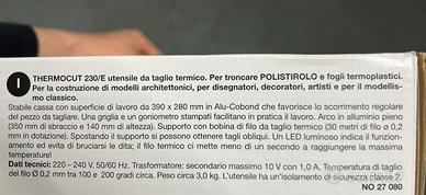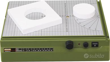 Vendo taglia polistirolo con filo a caldo per polistirolo e simili. Utilizzato in ambito universitario in design del prodotto per modelli e prototipi. Utilizzato poche volte oggetto pari al nuovo. Proxxon Thermocut 230/E è un archetto per taglio polistirolo da banco. Ideale per la costruzione di modelli architettonici, per disegnatori, decoratori, artisti (anche scuole d'arte), costruzione di prototipi e per il modellismo clasicco. - Il piano di lavoro ha uno specifico rivestimiento in ALU-COBOND che favorisce lo scorrimento regolare dal pezzo da tagliare. - Un grigliato e goniometro stampati facilitano in pratica il lavoro. - Una spia luminosa indica il funzionamiento ed evita di bruciarsi le dita. - La temperatura massima si raggiunge in meno di un secondo. Supporto con bobina di filo da taglio termico. 30mt. x 0,2mm. in dotazione. Dati Tecnici Superficie di lavoro: 390x280mm. 220-240V, 50/60Hz. Trasformatore secondario massimo 10volt con 1,0 A. Temperatura di taglio del filo 0,2mm. da 100 a 200 circa. Peso: 3,0Kg. circa. Isolamento di sicurezza classe 2 Arco in alluminio pieno con 350mm. di sbraccio e 140mm. di altezza interna.