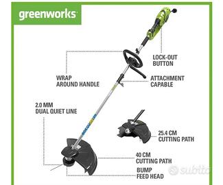 Greenworks tagliabordi e decespugliatore elettrico 230V - 1200 W. Taglio da 40 cm. filo da 2 mm. 5500 rpm. Maniglia regolabile. Praticamente nuovo. Usato una sola volta. Prezzo non trattabile.