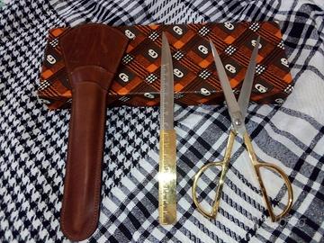 Tagliacarte e forbici in acciaio placcato oro con fodero in pelle di vitello California mai usati.