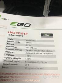 La ditta ego è dove è intatta una delle migliori aziende per prodotti da giardino a Batteria.produce articoli di altissima qualità sul quali riesce a dare fino a cinque anni di garanzia.nessun altra azienda riesce a produrre qualità al punto da dare una garanzia così lunga.disponibile in negozio il modella EGO LM2135 E-SP Con taglio da centimetri 52 e motore con batteria da 56 volts.corredata di una batteria da 7,5 Amber è considerata una macchina adatta a tagliare e mantenere Giardini fino ad oltre 1000 m².