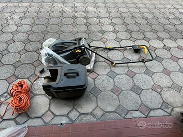 Vendo tagliaerba elettrico con alimentazione a filo, completo di cavo di alimentazione e cesto raccoglierba.