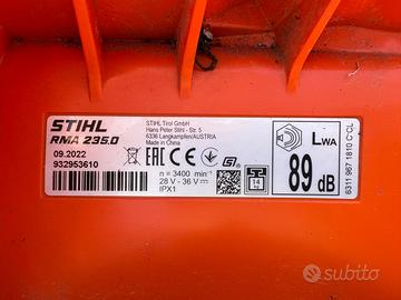 Info al 3505986165 Vendo per passaggio a modello autonomo tagliaerba a batteria STIHL RMA 235, acquistato meno di due anni fa e trattato con estrema cura. La macchina è praticamente nuova e perfettamente funzionante in ogni sua parte. È il modello ideale per chi cerca la massima maneggevolezza e la silenziosità di STIHL senza l'ingombro dei cavi o la manutenzione del motore a scoppio. Include la scheda di sicurezza. - GARANZIA ATTIVA: Fornisco scontrino d'acquisto originale (ancora nel periodo di garanzia legale), numero di serie corrispondente con la fattura e libretto di istruzioni incluso. - CONDIZIONI: Usato pochissimo, lama affilata e scocca pulita. - SISTEMA AK: Compatibile con tutte le batterie STIHL serie AK (AK 10, 20, 30). - CARATTERISTICHE: Larghezza taglio 33cm, cesto di raccolta da 30L con indicatore di riempimento, modalità ECO automatica per massimizzare la durata della batteria. L'annuncio si riferisce al SOLO CORPO MACCHINA. Batteria e caricabatterie non sono inclusi (ideale per chi possiede già altri prodotti STIHL a batteria). Eventualmente posso fornirli con sovraprezzo da concordare. Disponibile per visione e prova a Cesana Brianza Consegna a mano preferita. #Taglia Erba #Elettrico #Tosaerba #a batterie