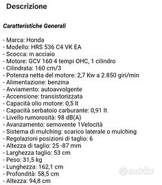 Vendo tagliaerba Honda con motore a benzina senza raccoglierba. Modello HRS536C. Altezza da terra regolabile e Smart drive. Usato tre anni, candela e filtro aria nuovi. Ottimo stato. Astenersi perditempo. prezzo trattabile. NON SPEDISCO