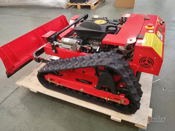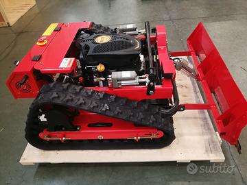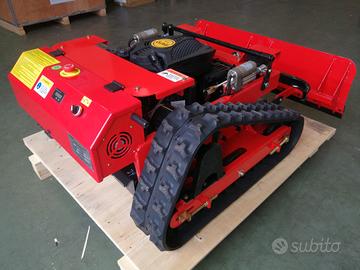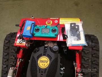 Tagliaerba Trincia Robot ibrido con motori brushless radiocomandata disponibile per prova su appuntamento 333 69 16 167 motore 4 tempi Rato o Loncin 225 cc Euro 5 nuovo modello 2025 con impianto radio dedicato professionale, motoriduttori brushed 24 volt batteria da 24 amp altezza regolabile taglio da radiocomando da 2cm a 15cm, movimento pala azionabile da radiocomando, avviamento e spegnimento da radiocomando, fari led azionabili da radiocomando, fail safe integrato, riesce a salire e scendere su pendenze fino 45 gradi e a lavorare lateralmente, largh 98cm lungh 130cm alt 52cm peso 140 kg