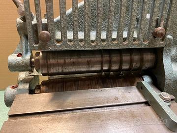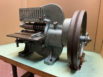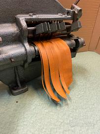 Tagliastrisce manuale per pelletteria, adattata con motore a frizione, trifase, perfettamente funzionante, con banco.