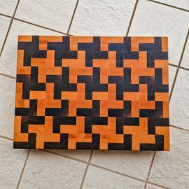 Bellissimo tagliere realizzato in legno massello con fibre di testa quindi molto più resistente ai tagli e aumenta la durata della lama dei coltelli rispetto ai normali taglieri, artigianale e trattato con olio di vaselina enologico quindi senza nessun prodotto nocivo per la salute. - Design unico con venature naturali. - Disegno geometrico - Realizzato in legno massello. Legno utilizzato: Faggio e Wengè. Misure 36x27x4cm circa compresi piedini in gomma. Si possono realizzare anche taglieri su misura.
