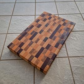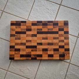 Bellissimo tagliere realizzato in legno massello con un design a blocchi alternati.