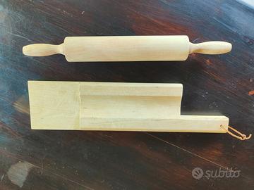 Vendo tagliere con mattarello, come da foto. Tagliere misure lung. 48 x larg. 12 cm, mattarello misure lung. 45 x larg. 5,5 cm circa.