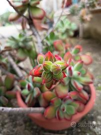 pianta molto bella ha delle rosette verdi con i bordi rosso rosato vellutate. cresce ad albero. fa dei fiorellini gialli a grappolo. si moltiplica facilmente basta piantare un ramo o una foglia. spedisco talea come ultima foto