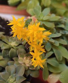 Talee di pianta grassa "sedum palmeri" quasi del tutto radicate,in questo momento in fioritura (foto marzo 2026). Misure come da foto. La pianta è molto rigogliosa,resiste all'esterno in ogni periodo dell'anno senza particolari cure. so sviluppa in modo strisciante e pendente. Fioritura in primavera con piccoli fiorellini gialli come da foto. Per altre informazioni o richieste scrivimi pure.