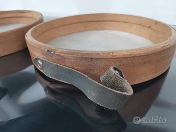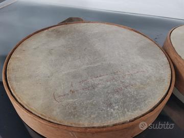 Coppia di tamburelli legno pelle manico in cuoio. Misure diametro 22,50 cm. Spessore 4 cm.
