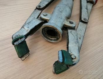 Tappabottiglie manuale per tappi in sughero. Un attrezzo vintage utilizzato per sigillare le bottiglie. Strumento manuale a due leve. Utilizzato per l'imbottigliamento casalingo di vino o altre bevande. Progettato per l'uso con tappi di sughero naturale o sintetici in plastica morbida. Realizzata in metallo con manici rossi per la presa.
