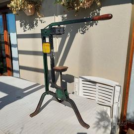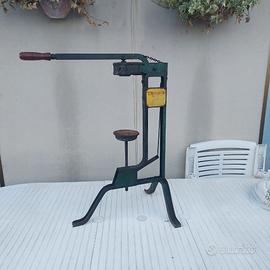 Tappatrice a mano per tappi in sughero, marca "L'AUTOMATICA". Materiale ferro/legno (il manico ed il supporto delle bottiglie). Colore verde/marrone. Dimensioni (B x H x P): 69x84x42,5 cm. Peso 11,20 kg. C'era anche una scritta "BREVETTATA" che mia moglie, in un momento di impulso per la pulizia, ha cancellato utilizzando uno sgrassatore universale. Se interessata/o vendo anche, a parte, coppia di damigiane rettangolari sovrapponibili (in vendita sul sito).