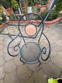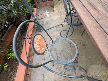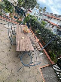 Vendo tavolo e sei sedie per giardino in ferro battuto con mosaico in mattonelle Dimensioni 96cm x 200 cm Le doge del tavolo ( vedi foto) sarebbero da cambiare con alte singole e con sezioni piu grandi oppure con un top unico o meglio come si preferisce . Anche due sedie sono da ripristinare la rete ( vedi foto)
