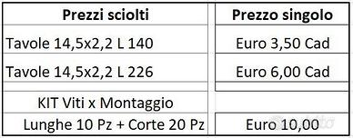 Tavole in Legno Abete massello di varie misure, per realizzare strutture da interno ed esterno, come Gazebi e Pergolati o altro. •38 Pz di Tavole lunghe 140 •29 Pezzi Tavole lunghe 220 Materiale utilizzato per manifestazione fieristica di soli 5 giorni quindi come nuovo. Descrizione e misure dei pezzi sono nell'ultima foto con prezzi a partire da 3,5 Euro. Se ritiro in blocco prezzo speciale 270 Euro compresi 2 Kit viti (invece che 330). Il Kit di ferramenta/viti è specifico per Legno. Ritiro zona Guidonia Marco Simone